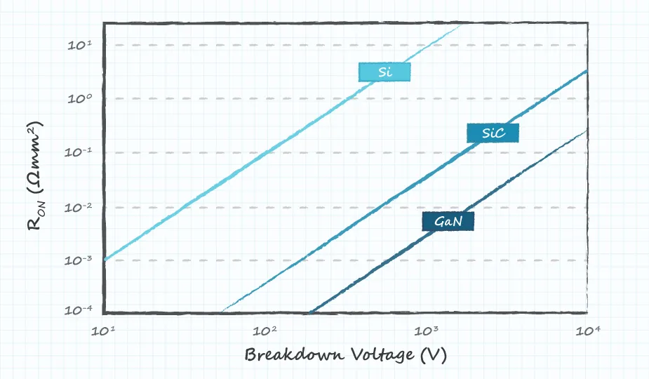 When turned on, a GaN transistor (like a silicon transistor) acts like a resistor between drain and source, usually denoted Ron, and conduction losses are proportional to this resistance. The main advantage of GaN and other WBG materials is their relationship between breakdown voltage and Ron. Figure 1 shows the theoretical limits of this relationship for silicon, GaN and silicon carbide (SiC, another WBG material). It can be seen that when a given breakdown voltage is reached, the Ron of WBG devices is much lower than that of silicon, and GaN is the lowest among the three. As silicon is approaching its theoretical limit, continuing to increase Ron will require the use of GaN and other WBG materials.
